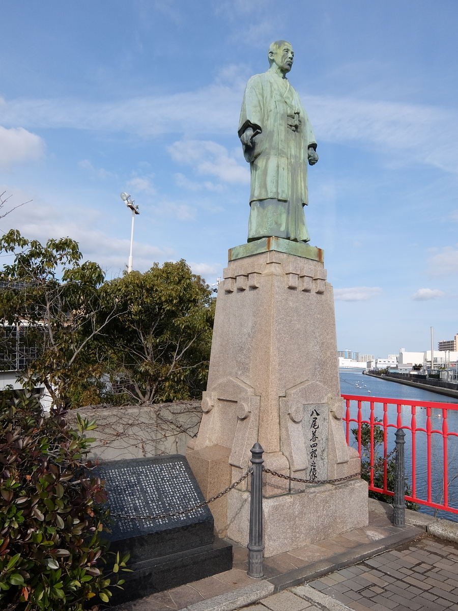 明治の時代に、この運河を作ったんかいなと思うとすごい熱意とエネルギーを感じる。高松橋のところには、その功労者の八尾善四郎の銅像が今も残っている。かなりの私財を投じたようなことが書かれてある。