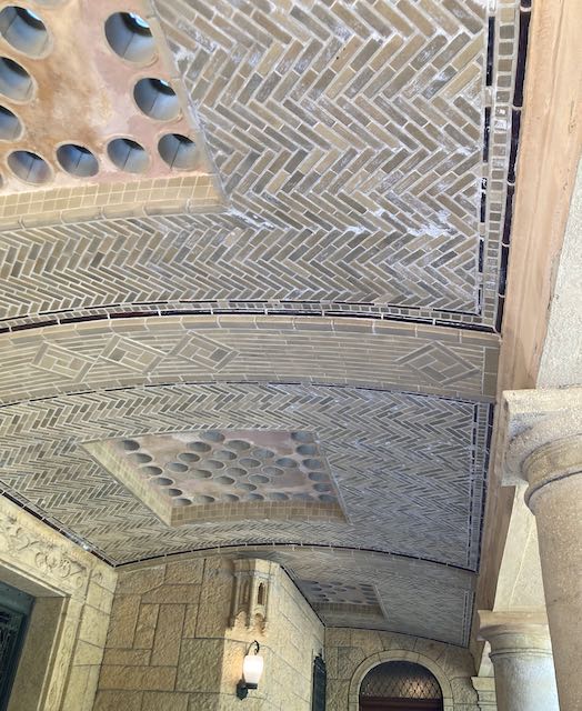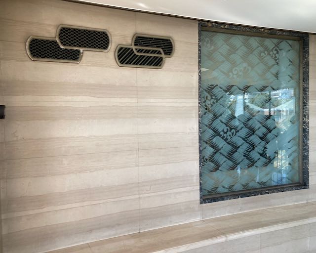 普通は気がつかないですが、壁には大理石が貼られ縞模様が連続しています。大きな大理石をスライスして使わないとこうは出来ないそうです。こちらでもセントラルヒーティングの吹き出し口の紋様は全て違っています。