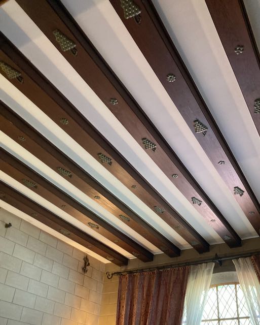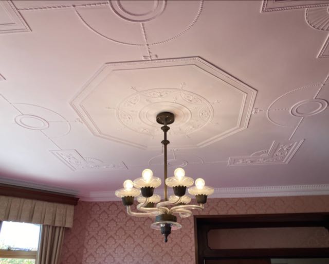 暖炉の周りに葡萄の彫り物が施されて、さりげない趣味の良さを感じます。当時から葡萄は幸福のシンボルだったらしいです。天井の装飾もユニークです。