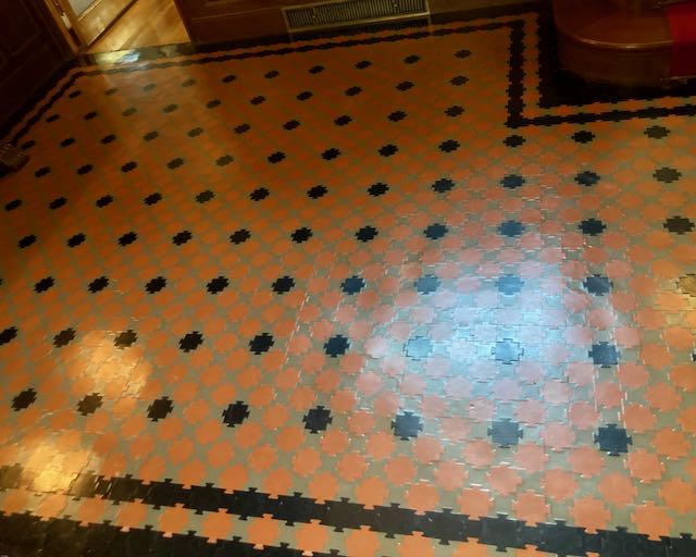 1階ロビーの床は当時のまま。ゴム製で幾何学模様が組まれて、全く古さを感じません。天井にも葡萄の彫り物がされ、隅々まで精密な装飾がされていることに驚かされます。