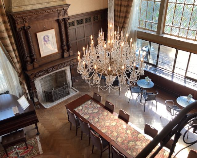 次は数々の映画やドラマに使われているゲストルームです。お客さまをもてなすのに使われた、いわゆる応接室です。正面に暖炉がありますが、部屋全体を温めるために窓際にはセントラルヒーティングの吹き出し口があります。地下がボイラー室になっており、各部屋には吹き出し口があります。そのデザインは全部違っていて、趣向の奥深さを感じます。