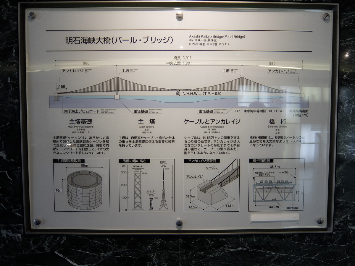 まずは舞子海上プロムナード。1Fには、明石海峡大橋の概要を説明したパネルがいくつか展示されている。サクッと頭に入れて、8Fの展望ラウンジに上がってみる。