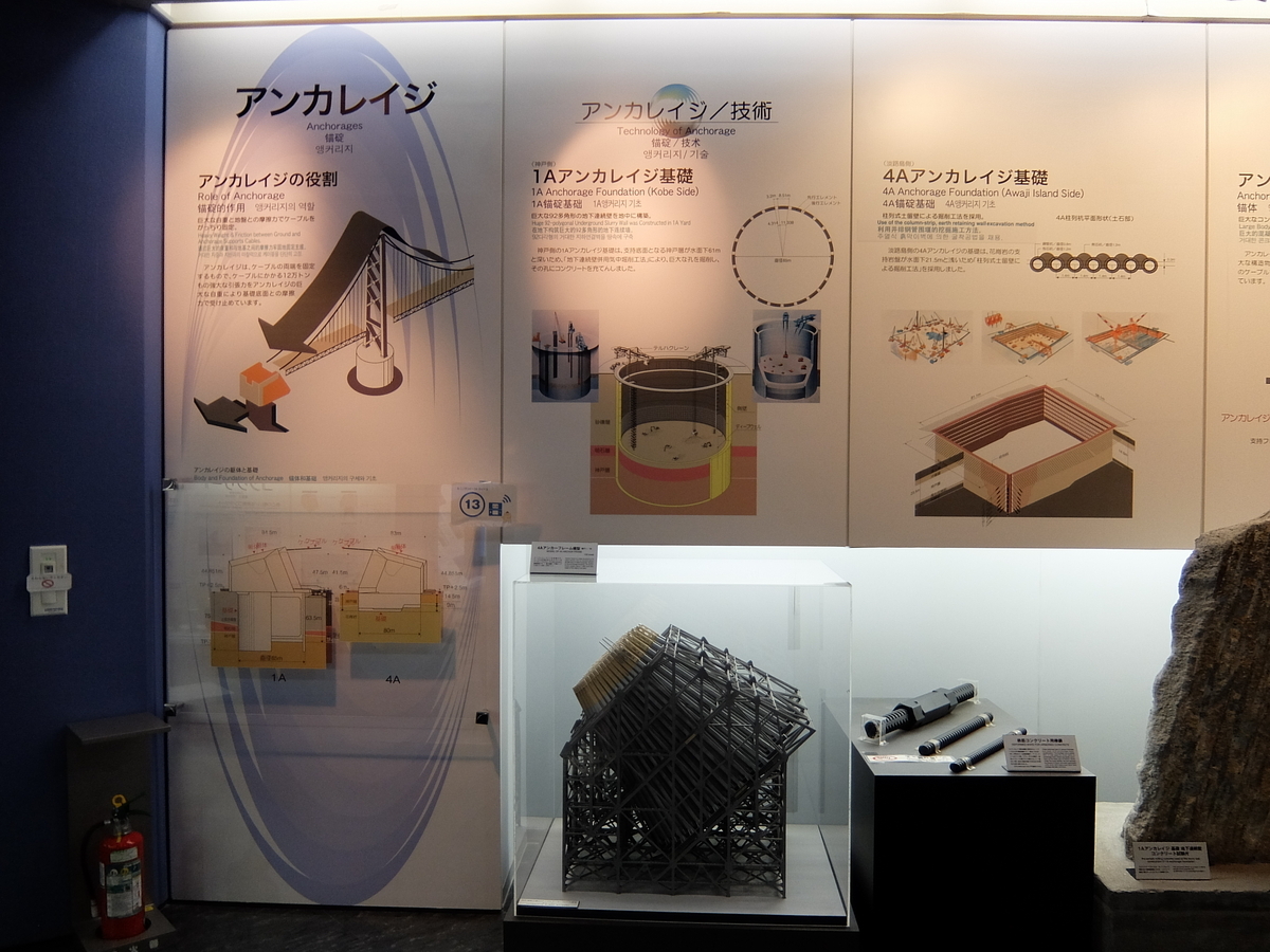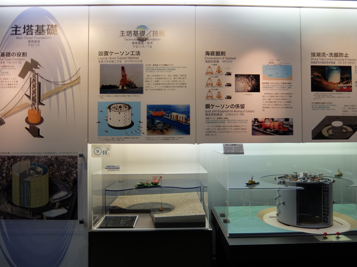 次に訪ねたのが、すぐ隣にある「橋の科学館」だ。ここでは、明石海峡大橋の建設に関しての様々な技術が模型やパネルで展示されている。吊り橋の構造はだいたいわかっていたとしても、吊り橋を支えている主塔や、ケーブルの両端を引っ張っているモノ(アンカレイジと呼ばれていることもはじめて知った)が一体どのぐらいの力に耐えれるように作ってあるのかとか、全く想像もできてなかった。