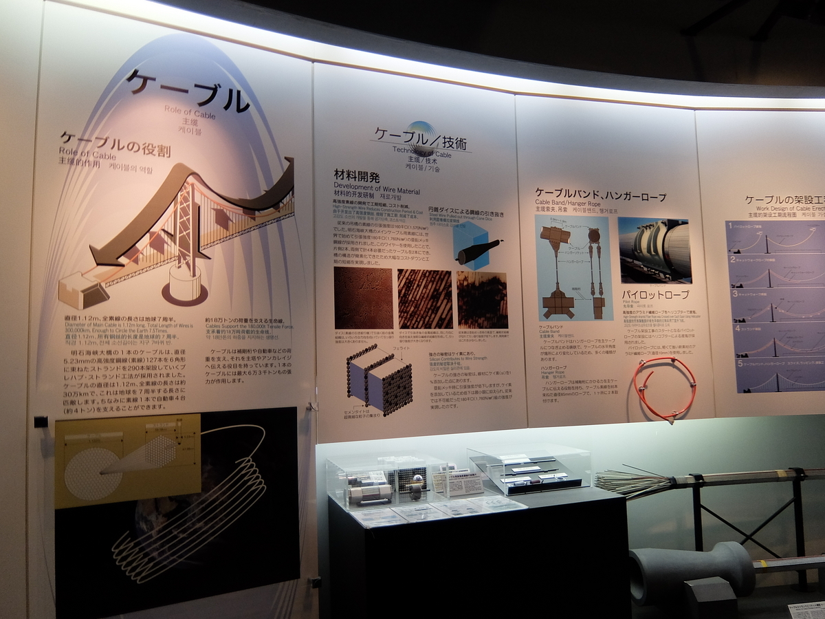 他にも色々な技術の展示があるのだが、一番わかりやすいのが、館内で上映されている映画を見ることだろう。3Dメガネをかけて、ちょっと立体的に見えるところも面白い。この映画で、主塔やアンカレイジやケーブルの仕組みや中身を説明してくれる。明石海峡大橋を支えている技術のすごさや、保守点検による安全性の確保・維持とかがよくわかる。最初にこの映画を見てから展示物を見ることをお薦めする。