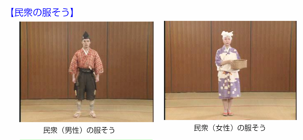 男性は、小袖と袴が一般的で武士以上に動きやすい服装になっています。腰には火打ち袋を下げ、腰刀を差しているのが一般的だったようです。
